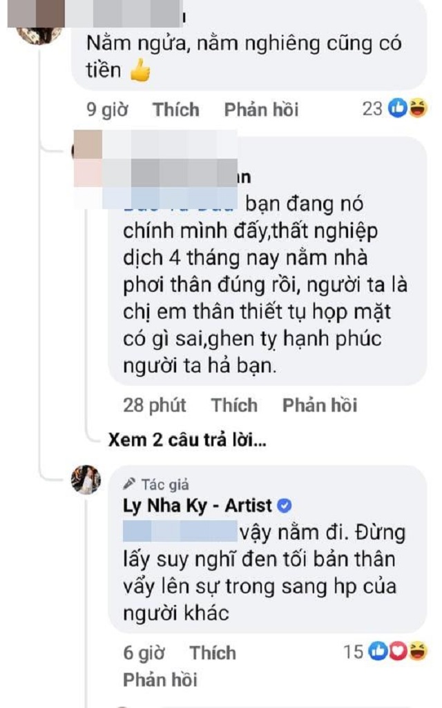 Khi một tài khoản khác ẩn ý: "Nằm ngửa nằm nghiêng cũng có tiền", nữ diễn viên mắng thẳng: "Vậy nằm đi. Đừng lấy suy nghĩ đen tối bản thân vẩy lên sự trong sáng, hạnh phúc của người khác".