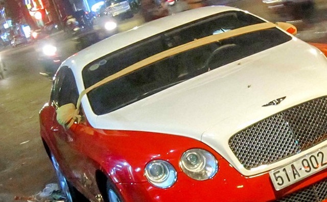 Xe sang Bentley biển số Sài Gòn cũng được chủ nhân buộc vải nối với nhau để chống trộm khiến nhiều người phải bật cười.