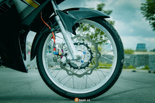 Mâm xe nguyên bản cũng được thay thế bằng bánh căm niềng nhôm Excel bạc đi kèm chân căm Nova. Bánh căm sẽ giúp giảm trọng lượng xe, đồng thời gia tốc nhanh hơn. Lốp Michelin City Crip Pro giúp tăng độ bám đường.