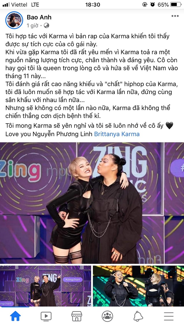 Hôm nay ngày 30/11, mạng xã hội Việt Nam xôn xao trước thông tin nữ vlogger, rapper gốc Việt Brittanya Karma qua đời sau nhiều ngày chống chọi với Covid-19. Ngay sau đó, trên trang cá nhân của ca sĩ Bảo Anh - người bạn thân thiết từng hợp tác chung với cô - cũng đã đăng tải dòng trạng thái khá dài bày tỏ nỗi thương tiếc trước sự ra đi của cô.