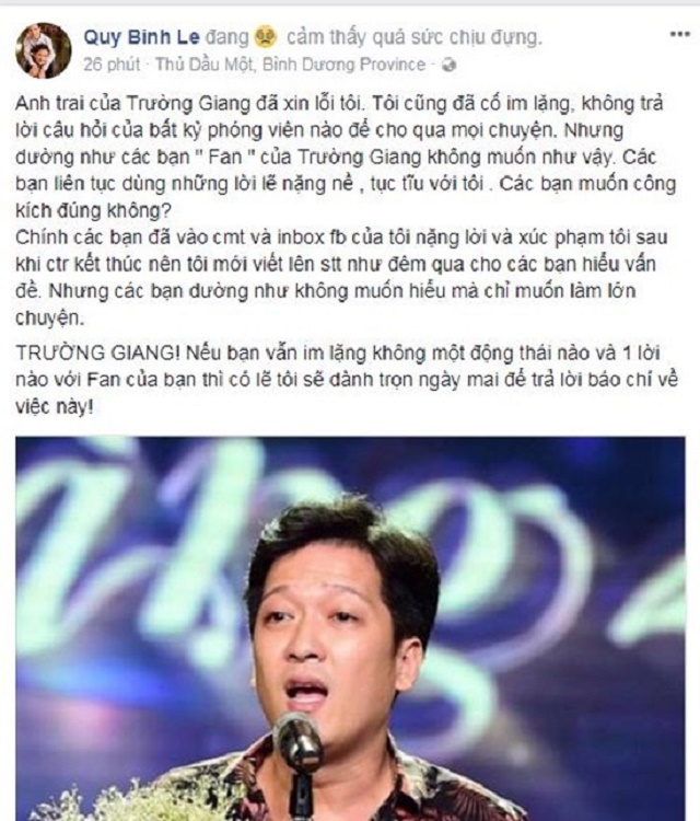 Trong chương trình Hẹn cuối tuần số mới nhất, MC Quý Bình đã một lần nữa lên tiếng về màn cầu hôn của Trường Giang, tiết lộ sự thật được che giấu suốt hơn 2 năm. Nam MC nói: "Về hành động ngày hôm đó, tôi hoàn toàn không sợ mất fan vì nó đúng với con người tôi. Không phải lúc nào tôi cũng hiền, phải làm theo người khác hay bênh vực những người thân của mình bất luận họ đúng hay sai. Tôi không bao giờ bênh vực ai một cách mù quáng.