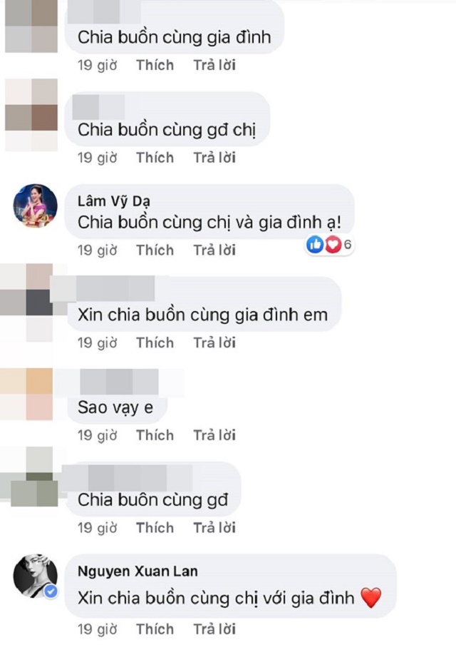 Ngay sau khi biết tin, nhiều sao Việt đã đau buồn gửi lời chia buồn đến gia đình Lâm Khánh Chi. Lâm Vỹ Dạ, Nhật Kim Anh, Thanh Thảo, Xuân Lan, Minh Nhí,NTK Chung Thanh Phong… đã đồng loạt gửi lời nhắn chia buồn đến mỹ nhân chuyển giới, động viên cô giữ gìn sức khỏe để lo cho đám tang.
