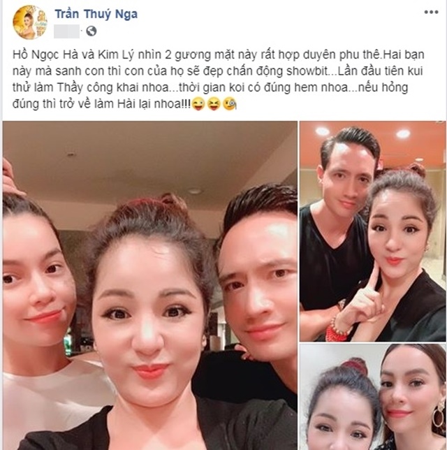 1 năm trước, Thúy Nga có dịp gặp Hồ Ngọc Hà và Kim Lý khi cùng lưu diễn ở Mỹ. Ngay khi gặp họ, cô đã đưa ra lời dự đoán: “Hồ Ngọc Hà và Kim Lý nhìn hai gương mặt này rất hợp duyên phu thê. Hai bạn này mà sinh con, thì con của họ sẽ đẹp chấn động showbiz. Lần đầu tiên tôi thử làm “thầy” công khai nha... Thời gian coi có đúng không nha... Nếu không đúng thì trở về làm hài lại nha”.