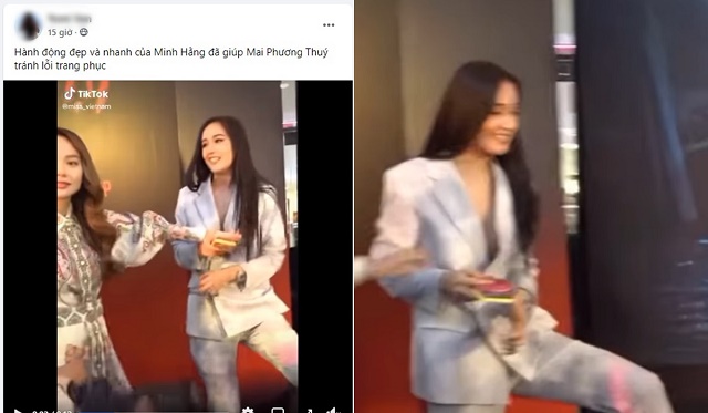 Theo đó, Mai Phương Thúy đã diện một chiếc áo vest hờ hững, để lộ vòng 1 lấp lộ. Khi di chuyển, nàng hậu suýt chút thì ‘lộ hàng’, Minh Hằng đã nhanh trí lao đến và dùng tay che chắn, giúp Mai Phương Thúy thoát khỏi một tình huống nguy hiểm.