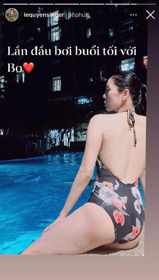 Mới đây, Lệ Quyên gây xôn xao khi đăng ảnh diện bikini lên story Facebook cá nhân kèm caption: "Lần đầu bơi buổi tối với Bo".