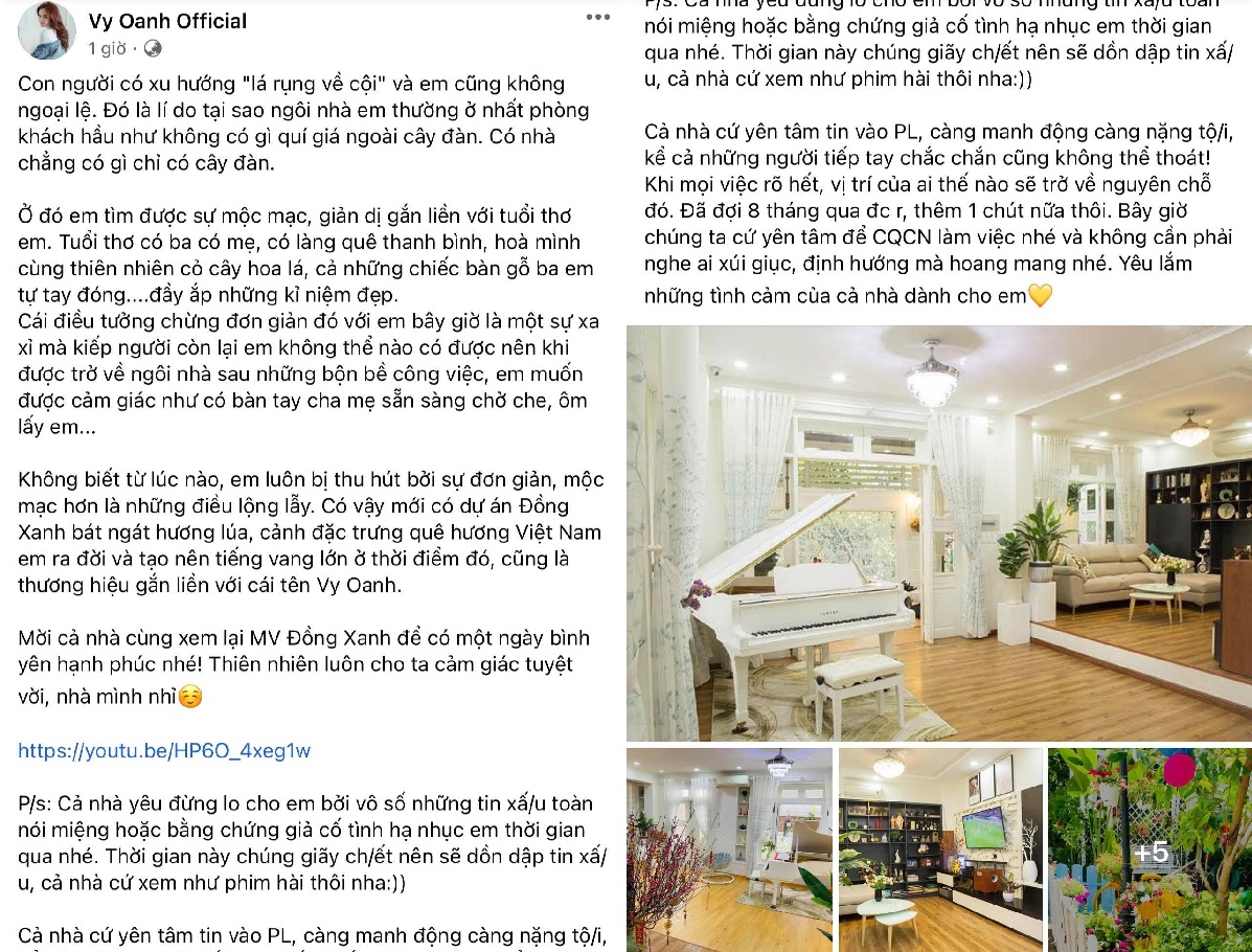 Trước phản ứng tiêu cực của khán giả, chiều 14/11, nữ ca sĩ chính thức lên tiếng phân trần về lý do để phòng khách "đơn sơ, giản dị" dù sở hữu tài sản khủng. Bài đăng trên trang fanpage Vy Oanh official có nội dung như sau: