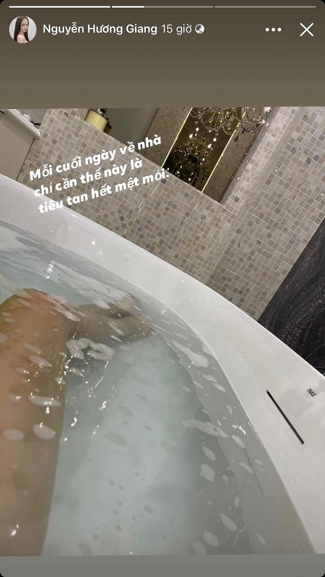 Giọng ca Anh Đang Ở Đâu Đấy Anh chia sẻ khoảnh khắc thư giãn trong bồn tắm sau một ngày làm việc chăm chỉ. Cô cảm thán: "Mỗi cuối ngày về nhà chỉ cần thế này là tiêu tan hết mọi thứ". Đặc biệt, người đẹp sinh năm 1992 còn "úp mở" khoe khéo đôi chân dài miên man, trắng trẻo nõn nà khiến netizens ngượng ngùng, "đỏ mặt".