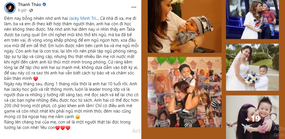 "Đêm nay bỗng nhiên nhớ anh hai Jacky Minh Trí… Cả nhà đi xa, mẹ đi làm, ba và em đi theo kết hợp thăm người thân, anh hai còn đi học nên không theo được. Mẹ nhớ anh hai đêm nay vì nhìn thấy em Talia được ba cưng quá! Em chỉ nghẹt mũi khó thở khi ngủ, mà ba đã bế em trên vai, đi vòng vòng khắp phòng để em ngủ ngon hơn, xoa đầu xoa mũi để em dễ thở. Em luôn được nằm bên cạnh ba và mẹ ngủ mỗi ngày. Còn anh hai là con trai, lại lớn rồi nên phải tập ngủ phòng riêng, tập sự tự lập và cứng cáp, nhưng thú thật nhiều lần mẹ rơi nước mắt khi nghĩ đến cảnh anh lủi thủi một mình trong phòng. Cứ ráng kềm lòng lại để tập cho anh hai sự mạnh mẽ, không dựa dẫm vào bất kỳ ai, để sau này có ra sao thì anh hai vẫn biết cách tự bảo vệ và chăm sóc bản thân mình.