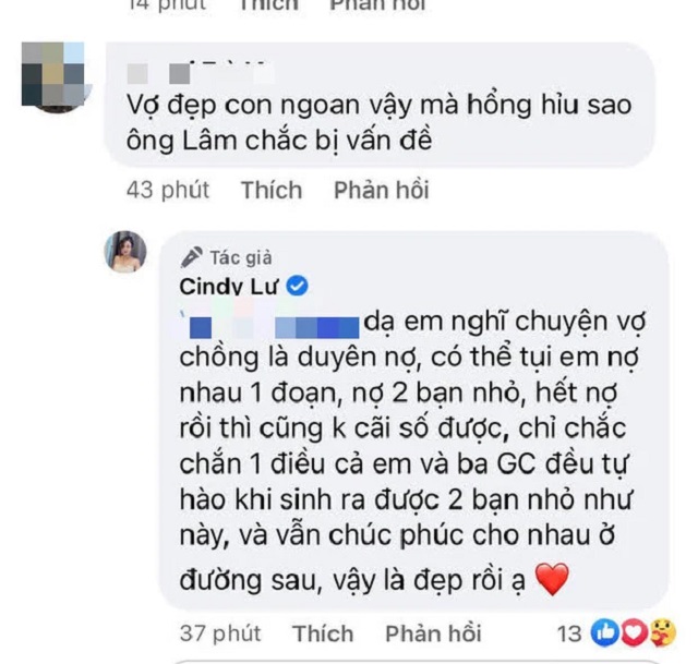 Không những vậy, khi có người mỉa mai giọng ca Hoa Nở Không Màu rằng: "Vợ đẹp con ngoan vậy mà hổng hiểu sao, ông Lâm chắc bị vấn đề", Cindy Lư cũng phản hồi đầy tinh tế: "Dạ em nghĩ chuyện vợ chồng là duyên nợ, có thể tụi em nợ nhau 1 đoạn, nợ hai bạn nhỏ, hết nợ rồi thì cũng không cãi số được, chỉ chắc chắn một điều là cả em và ba Gà Cún (2 con chung của Hoài Lâm và vợ cũ) đều tự hào khi sinh ra được bạn nhỏ như này và vẫn chúc phúc cho nhau ở đường sau. Vậy là đẹp rồi ạ".