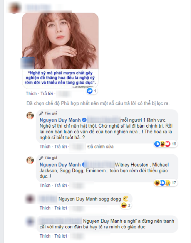Trong một bài viết gần đây trên trang cán nhân, khi được một cư dân mạng hỏi ý kiến về phát ngôn của Lưu Hương Giang, Duy Mạnh đã thẳng thắn bày tỏ: “Mỗi người 1 lĩnh vực. Nghệ sĩ thì chỉ nên hát thôi, chứ nghệ sĩ lại đi bàn chính trị, rồi lại còn bàn luận cả vấn đề của bọn nghiện nữa ..! Thế hoá ra là nghệ sĩ biết tuốt hả..?”.