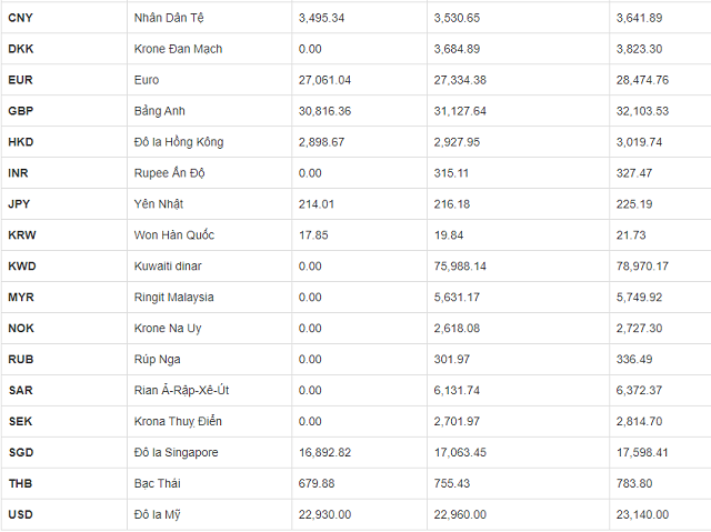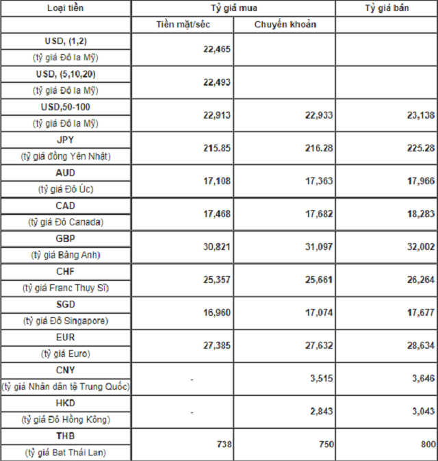Các ngân hàng thương mại giữ tỷ giá ngoại tệ đồng USD phổ biến ở mức 22.970 đồng (mua) và 23.150 đồng (bán). Vietcombank niêm yết tỷ giá ở mức: 22.970 đồng/USD và 23.150 đồng/USD. Vietinbank: 22.965 đồng/USD và 23.165 đồng/USD. ACB: 22.980 đồng/USD và 23.140 đồng/USD.