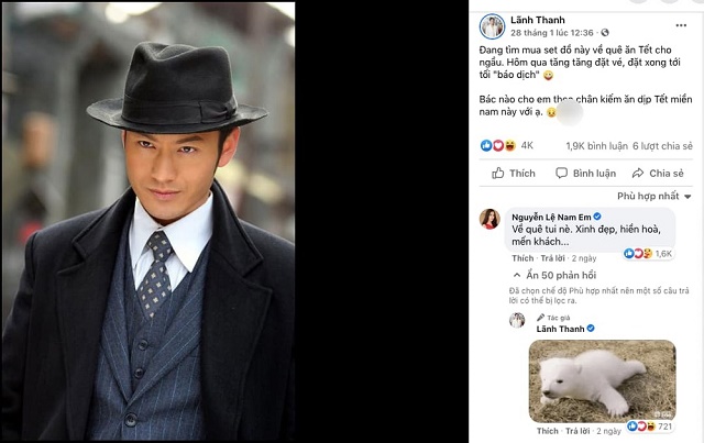 Nam Em không ngần ngại vào hẳn status của bạn trai để "mời mọc": "Về quê tui nè. Xinh đẹp, hiền hoà, mến khách…”. Lãnh Thanh sau đó đã bình luận icon hình con gấu trắng dễ thương để đáp lại lời mời của Nam Em. Có thể thấy, cặp đôi sau sóng gió lại trở về bên nhau, vui vẻ "như chưa hề chia ly".