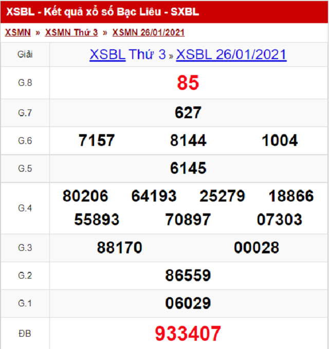 Kết Quả Sổ Xố Bạc Liêu Thứ 3 ngày 26/1/2020