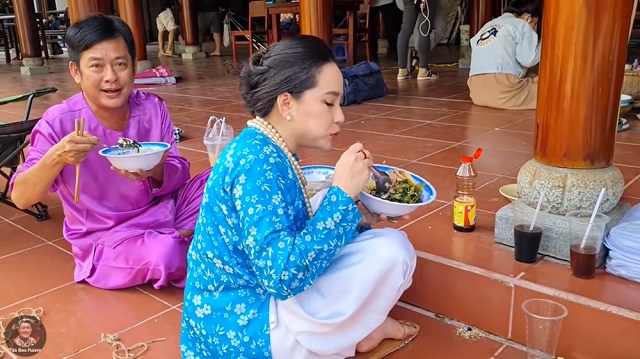 "Đấy, mọi người nhìn đi, đoàn phim chúng tôi ăn cơm như vậy đó, phải ngồi bệt, ngồi xổm mà ăn. Ai không biết lại tưởng nghệ sĩ chúng tôi cao sang, chảnh chọe lắm nhưng không phải. Hoặc, cũng có người cao sang nhưng tôi không biết, riêng chúng tôi thì cứ bình dân thế này thôi, nghệ sĩ nào cao sang là việc của họ. Nói thật, được đi làm và ăn cơm đoàn thế này là niềm hạnh phúc lớn nhất với nghệ sĩ chúng tôi, không gì bằng", Tấn Beo thích thú bày tỏ.