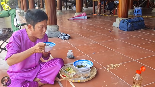 Một số nghệ sĩ có cảnh quay thì vẫn đang diễn còn những người hết cảnh như tôi thì tranh thủ ăn trong lúc người ta diễn, phải ăn lấy sức để còn diễn. Mọi người thấy đấy, bữa cơm đi làm của nghệ sĩ chúng tôi đạm bạc, đơn giản lắm, cũng chỉ có rau muốn xào, cá và mực. Bữa ăn của tôi rất đơn giản, không có gì cả. Các nghệ sĩ khác cũng chỉ ăn như vậy thôi, không hơn gì.