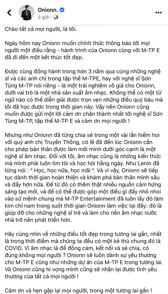 Tuy nhiên, mới đây, Onionn gây chú ý khi đăng đàn thông báo trên trang cá nhân chuyện rời khỏi M-TP Entertainment chỉ sau 1 năm gắn bó.