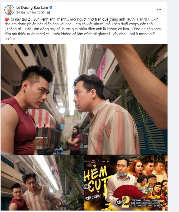 Lê Dương Bảo Lâm liên tục 'mặt dày' cầu xin vai diễn, Trấn Thành liền trả lời 1 câu 'chí mạng'Lê Dương Bảo Lâm cũng không ít lần để lại bình luận dưới bài đăng của Trấn Thành để xin vai khiến khán giả cười nghiêng ngả. Đáng nói, Trấn Thành đã để lại 1 bình luận ‘chí mạng’ trước lời xin xỏ của Lê Dương Bảo Lâm: “Sai chính tả quá sao đóng điện ảnh được? Kkk”.