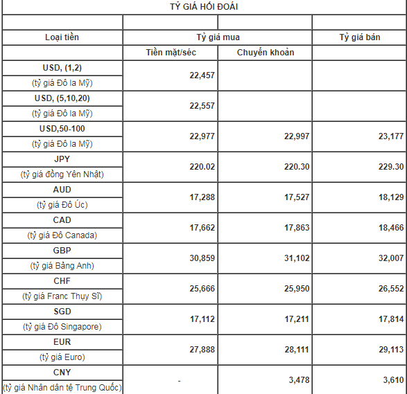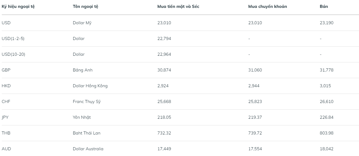 Cụ thể, Vietcombank niêm yết tỷ giá 22.980/USD - 23.190/USD, Vietinbank niêm yết tỷ giá 22.948/USD - 23.178/USD, Techcombank là 23.016/USD - 23.216/USD, BIDV niêm yết tỷ giá 22.977/USD - 22.997/USD.