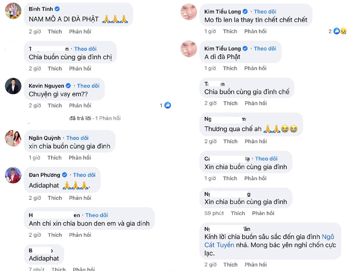 -Ba nuôi Cát Tuyền - ông Lê C. bàng hoàng: Con ơi! Bố vô cùng ngỡ ngàng mới lướt qua Facebook và được biết ba con vừa ra đi Vĩnh Viễn rồi ! Bố không biết nói gì hơn chỉ biết chia xẻ sự mất mát vô cùng to lớn này của con ! Nguyện cầu Ba con sớm đư ợc về Phật Quốc ! A Di Đà Phật!
