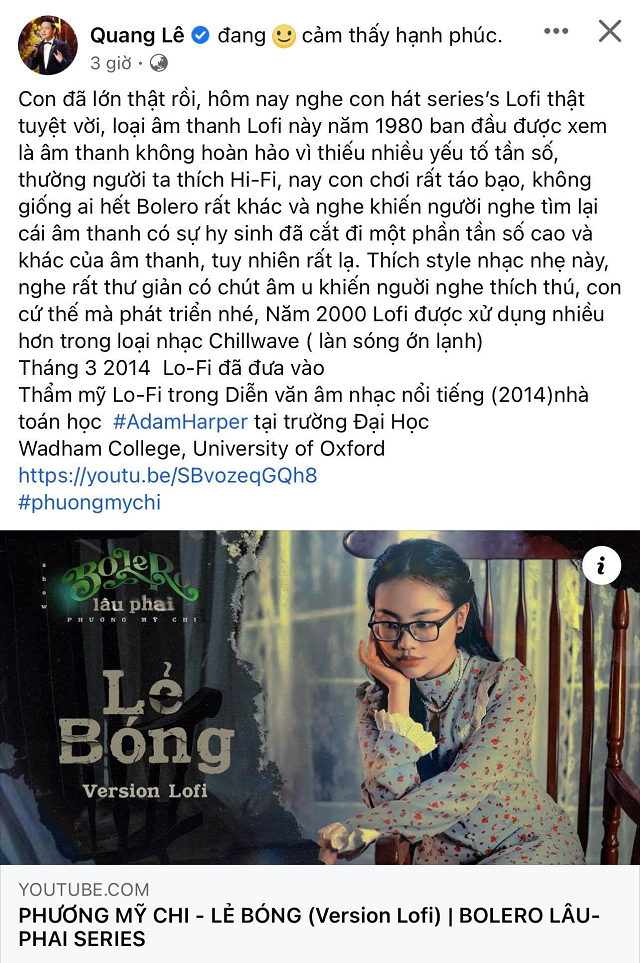 Mới đây, trên fanpage Facebook có 2,9 triệu lượt theo dõi, Phương Mỹ Chi đã có chia sẻ gây chú ý về quá trình làm lại ca khúc Lẻ Bóng version Lo-Fi. Cụ thể, nữ ca sĩ chia sẻ: