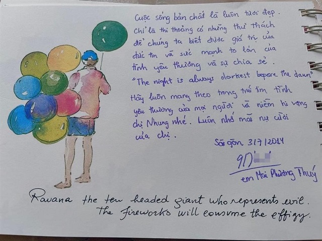 Mới đây, người đẹp sinh năm 1989 đã chia sẻ hình ảnh chụp lại bức thư tay được cô viết từ năm 2014 để gửi đến người chị tên Nhụng. Nguyên văn nội dung như sau: "Cuộc sống bản chất là luôn tươi đẹp. Chỉ là thi thoảng có những thử thách để chúng ta biết được giá trị của đức tin và sức mạnh to lớn của tình yêu thương và sự sẻ chia. 'The night is always darkest before the dawn (Trước bình minh luôn là màn đêm đen tối nhất)'. Hãy luôn mang theo trong trái tim mình tình yêu thương của mọi người và niềm hy vọng, chị Nhung nhé. Luôn nhớ mãi nụ cười của chị".