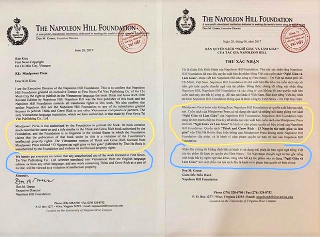 Thư xác nhận bản quyền của The Napoleon Hill Foundation gửi First News