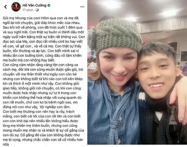 Vài ngày trước, MXH xôn xao khi Phi Nhung bất ngờ đăng đàn, bức xúc vì con trai Hồ Văn Cường không nghe lời, thậm chí còn lo lắng rằng cậu bé sẽ mắc bệnh ngôi sao. Cụ thể, cô viết trên trang cá nhân rằng: "Lớn không biết chào hỏi ai trong gia đình. Tết đến con không lau chùi bàn thờ, dọn dẹp nhà cửa, ăn cơm với gia đình. Một năm nay, ngoài đi học và đi hát là xuống nhà, còn lại con ở trong phòng. Mẹ không dạy con được mẹ phải nhờ cộng đồng mạng dạy con. Mẹ sẽ chấp nhận mọi người trách mẹ chứ không thể để con hư. Tôi cấm fan của Hồ Văn Cường chiều chuộng bạn ấy quá, dễ bị bệnh ngôi sao. Lần này, mẹ dạy con không được nữa thì hết duyên".