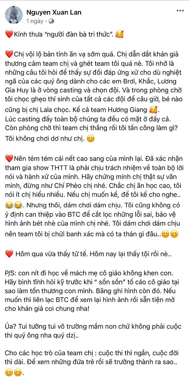 Nên tém tém cái nết cao sang của mình lại. Đã xác nhận tham gia show THTT là phải chịu trách nhiệm về toàn bộ lời nói và hành xử của mình. Hãy chứng minh chị thật sự văn minh, đừng như Chí Phèo chị nhé. Chắc chị ăn học cao, tôi nói ít chị hiểu nhiều. Nếu chị muốn kể, để tôi kể cho nghe. Nhưng thôi, dám chơi dám chịu. Tôi cũng không có ý định can thiệp vào BTC để cắt lọc những lỗi sai, bảo vệ hình ảnh bét nhè của mình chị nhé. Tôi dám chơi dám chịu nên team tôi bị chửi banh xác mà có ta thán gì đâu.