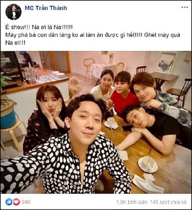 Mới đây, Trấn Thành vừa đăng tải trên trang cá nhân bức ảnh chụp chung với bà xã Hari Won, danh hài Lê Giang, ca sĩ Trúc Nhân và diễn viên Quang Trung tại một quán nước ở Sài Gòn kèm dòng caption than thở: "Ế show! Na ơi là Na! Mày phá bà con dân làng không ai làm ăn được gì hết. Ghét mày quá Na ơi".