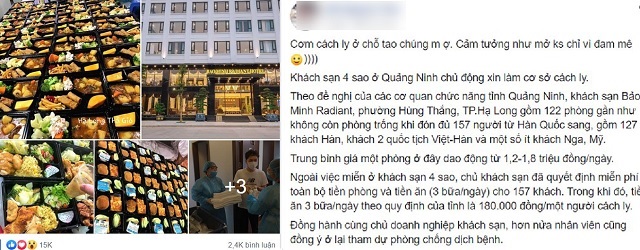 Đặc biệt, tại Quảng Ninh - nơi đón các chuyến bay từ những điểm nóng của dịch Covid-19 như Trung Quốc, Hàn Quốc và châu Âu với hàng trăm công dân Việt Nam, người nước ngoài về Cảng hàng không quốc tế Vân Đồn, nhiều khách sạn hàng đầu trên địa bàn tỉnh cũng chủ động xin làm cơ sở cách ly. Một trong số đó là một khách sạn tại Hạ Long chuẩn bị sẵn sàng 120 phòng nghỉ tiêu chuẩn 4 sao để làm điểm cách ly y tế cho 157 hành khách trở về từ các vùng dịch Covid-19 và phục vụ suất ăn tiêu chuẩn miễn phí có mức 180.000/người/ngày với thực đơn phong phú bắt mắt khiến nhiều người trầm trồ.