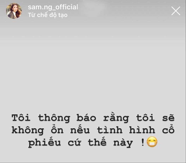 Tại thời điểm mà dịch Covid-19 diễn biến vô cùng phức tạp thì không ít nhà kinh doanh phải lao đao. Mới đây, Sam cũng phải lên tiếng thừa nhận mình bị ảnh hưởng lớn vì đại dịch. Trên trang cá nhân, hot girl nổi tiếng viết: “Tôi thông báo rằng, tôi sẽ không ổn nếu tình hình cổ phiếu cứ thế này”.