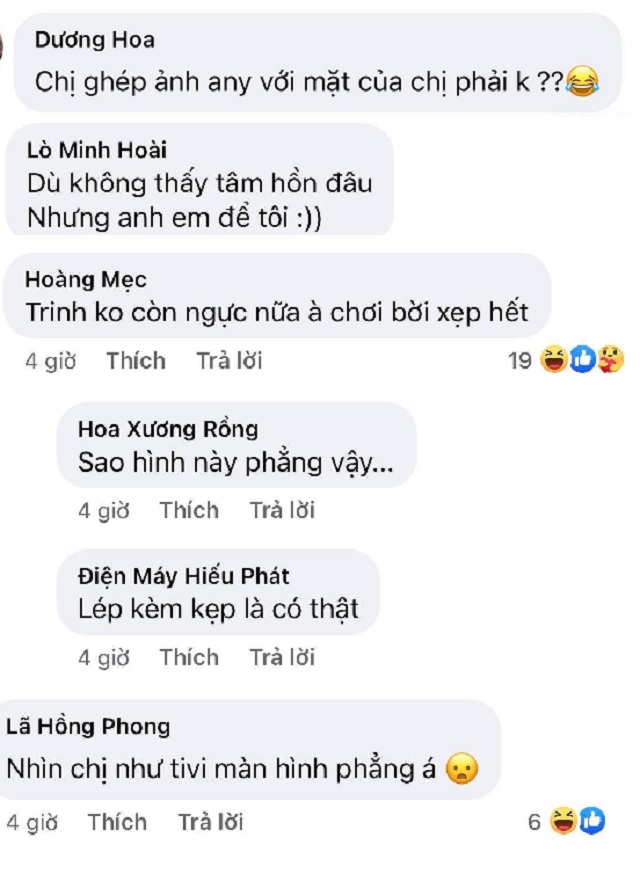 Bên dưới bình luận, cư dân mạng thi nhau "hỏi thăm" vòng 1 của Ngọc Trinh: "Chị ghép ảnh anh người yêu với mặt chị đúng không?", "Trinh không còn ngự* nữa à, chơi bời xẹp hết", "Sao hình này phẳng vậy", "Lép kèm kẹp là có thật", "Nhìn chị như TV màn hình phẳng á", ...
