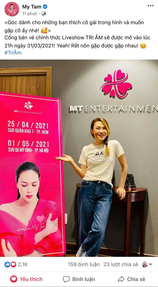 Mới đây, trên trang fanpage Facebook, Mỹ Tâm đăng tải hình ảnh xinh đẹp cùng thông báo quan trọng có nội dung như sau: "Cổng bán vé chính thức Liveshow TRI ÂM sẽ được mở vào lúc 21h ngày 31/03/2021! Yeah! Rất nôn được gặp nhau!".