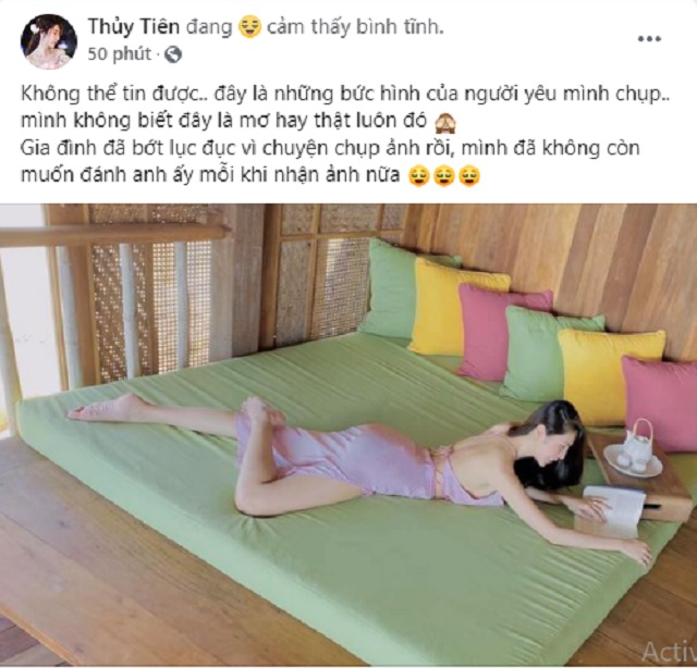 Mới đây, trên trang fanpage hơn 10,3 triệu lượt theo dõi, Thủy Tiên bất ngờ có dòng chia sẻ gây chú ý. Cụ thể, giọng ca Ngải Tình viết: "Không thể tin được.. đây là những bức hình của người yêu mình chụp.. mình không biết đây là mơ hay thật luôn đó. Gia đình đã bớt lục đục vì chuyện chụp ảnh rồi, mình đã không còn muốn đánh anh ấy mỗi khi nhận ảnh nữa".