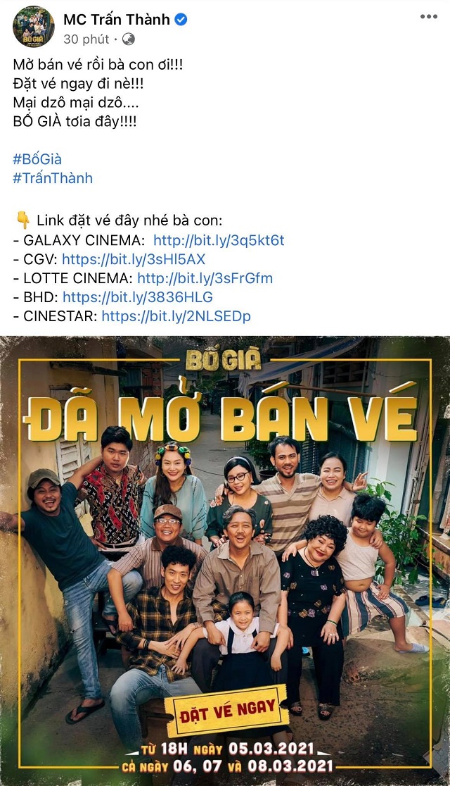 Sáng sớm hôm nay 3/3, trên trang fanpage hơn 10 triệu lượt thích, Trấn Thành thông báo tin vui tới tất cả khán giả. Cụ thể, nam MC viết: "Mở bán vé rồi bà con ơi! Đặt vé ngay đi nè! Mại dzô mại dzô... BỐ GIÀ tới đây!!!".