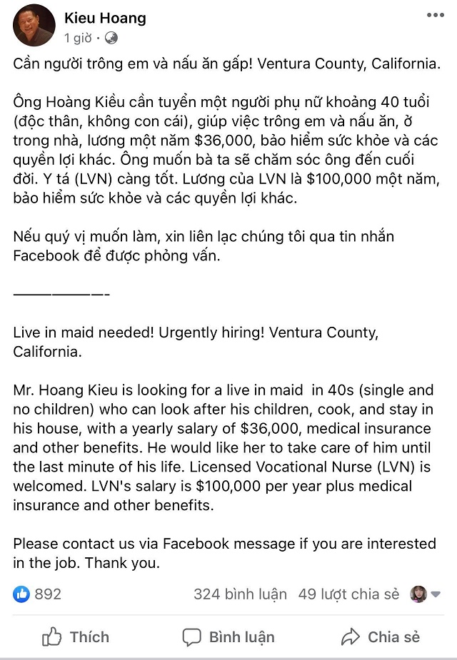 Ông Hoàng Kiều cần tuyển một người phụ nữ khoảng 40 tuổi (độc thân, không con cái), giúp việc trông em và nấu ăn, ở trong nhà, lương một năm $36,000, bảo hiểm sức khỏe và các quyền lợi khác. Ông muốn bà ta sẽ chăm sóc ông đến cuối đời. Y tá (LVN) càng tốt. Lương của LVN là $100,000 một năm, bảo hiểm sức khỏe và các quyền lợi khác.