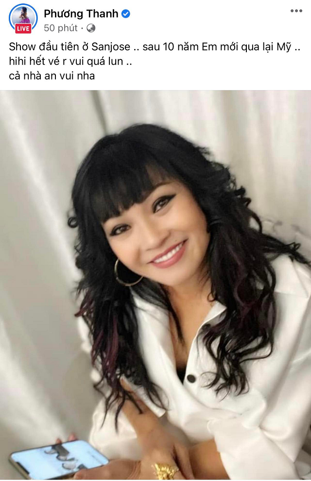 Trước chia sẻ của Phương Thanh, khán giả không khỏi lo lắng, sốt sắng hỏi han. Nữ ca sĩ mới đây đã tiết lộ tình hình hiện tại ở Mỹ. Cô chia sẻ hình ảnh mới nhất với caption: "Show đầu tiên ở Sanjose, sau 10 năm em mới qua lại Mỹ. Hết vé rồi vui quá luôn. Cả nhà an vui nha".