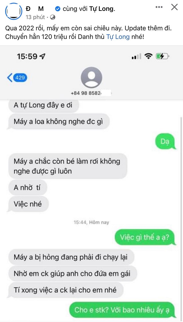 Theo đó, anh Đ. - đàn em thân thiết của Tự Long - bất ngờ nhận được tin nhắn từ số điện thoại lạ. Đối phương tự nhận là Tự Long, than thở máy điện thoại bị con nghịch nên hỏng loa không thể gọi điện trực tiếp được. Khi được anh Đ. trả lời, kẻ mạo danh liền nhờ chuyển số tiền 12 triệu đồng đến số tài khoản lạ với lý do máy hỏng, không tự chuyển tiền cho em gái được. Người này còn trực tiếp gửi số tài khoản và giục Đ. mau mau chuyển vì em gái "cần gấp".