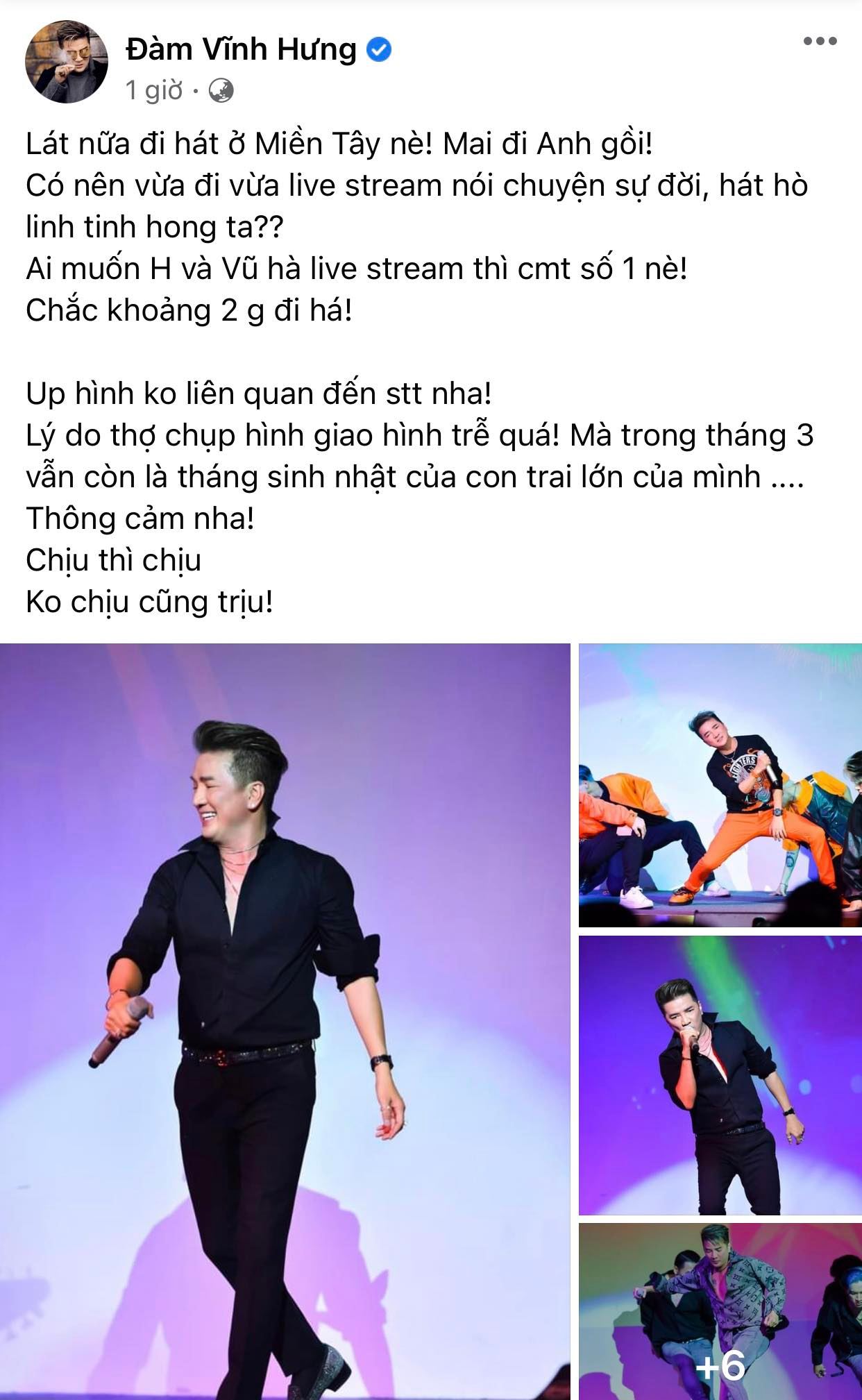 "Lát nữa đi hát ở Miền Tây nè! Mai đi Anh gồi! Có nên vừa đi vừa live stream nói chuyện sự đời, hát hò linh tinh hong ta?? Ai muốn H và Vũ hà live stream thì cmt số 1 nè! Chắc khoảng 2 giờ đi há!
