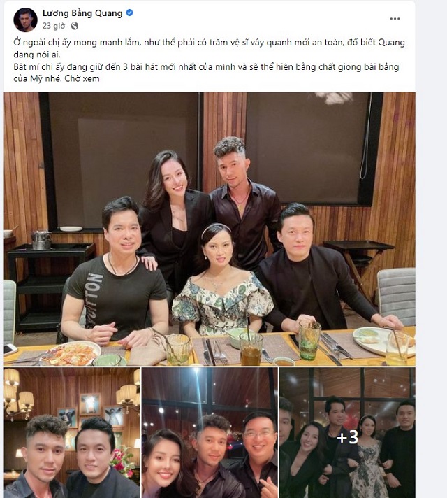 Tuy nhiên, gây chú ý hơn là dòng caption được Lương Bằng Quang chia sẻ:‘Ở ngoài chị ấy mong manh lắm, như thể phải có trăm vệ sĩ vây quanh mới an toàn, đố biết Quang đang nói ai. Bật mí chị ấy đang giữ đến 3 bài hát mới nhất của mình và sẽ thể hiện bằng chất giọng bài bảng của Mỹ nhé. Chờ xem!’.