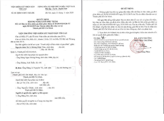 Mới đây, Viện KSND tối cao kháng nghị hủy bản án sơ thẩm vụ án tranh chấp về hôn nhân và gia đình giữa bà Lê Hoàng Diệp Thảo và ông Đặng Lê Nguyên Vũ. Đánh giá bản án sơ thẩm và phúc thẩm có nhiều vi phạm về tố tụng và nội dung, Viện KSND tối cao đã kháng nghị theo thủ tục giám đốc thẩm vụ án tranh chấp về hôn nhân và gia đình giữa bà Lê Hoàng Diệp Thảo (47 tuổi, Tổng giám đốc Công ty TNHH MTV TNI) và ông Đặng Lê Nguyên Vũ (49 tuổi, Chủ tịch HĐQT kiêm Tổng giám đốc Công ty CP Tập đoàn Trung Nguyên).