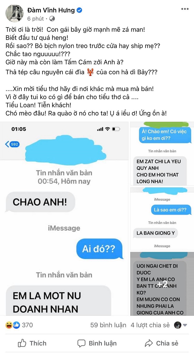 Trong khi dân tình xuýt xoa vì cái giá không tưởng, bạn thân Vũ Hà trêu chọc đòi "thế chỗ" thì Đàm Vĩnh Hưng lại vô cùng tức giận trước hành động sỗ sàng của người nhắn tin. Thậm chí, nam ca sĩ còn "nóng" đến mức công khai nói tục khiến dân tình không khỏi choáng váng.
