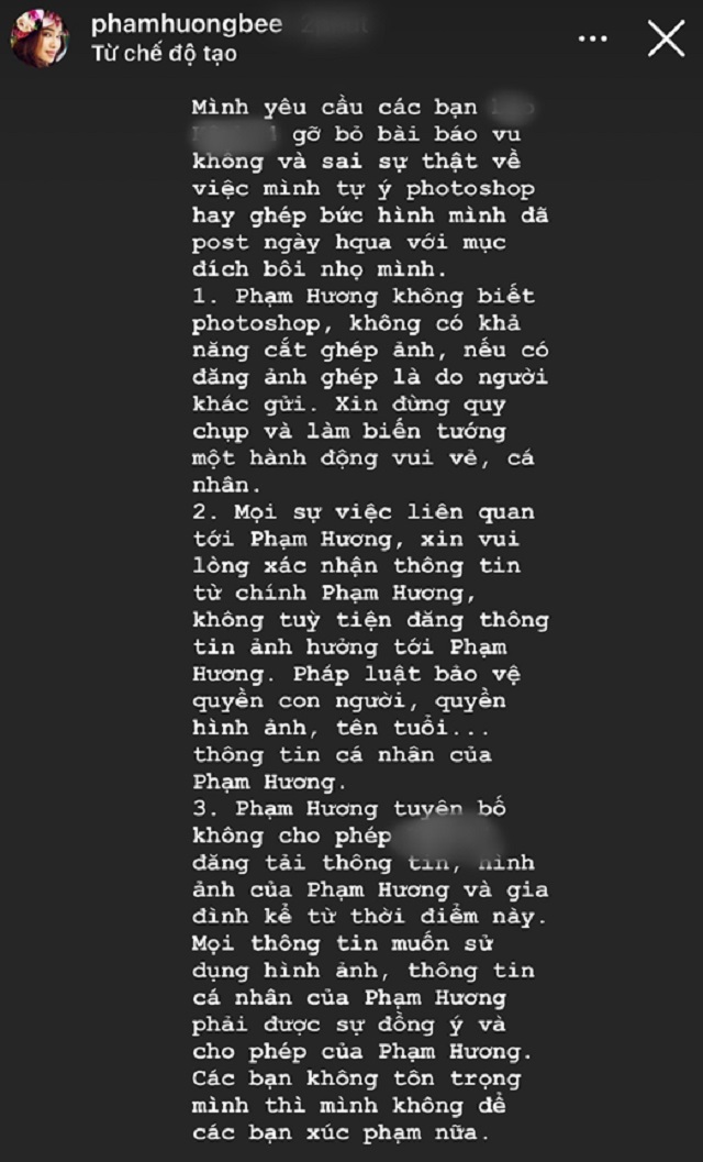 Chính vì thế, dưới bình luận nhiều người cho rằng Phạm Hương đã cắt ghép người khác ra khỏi khung ảnh để mình được đứng giữa khung hình. Vấp phải nhiều ý kiến trái chiều, Hoa hậu Phạm Hương lập tức đáp trả cực gắt: “Phạm Hương không biết photoshop, không có khả năng cắt ghép ảnh, nếu có đăng ảnh ghép là do người khác gửi. Xin đừng quy chụp và làm biến tướng một hành động vui vẻ, cá nhân. Mọi sự việc liên quan tới Phạm Hương, xin vui lòng xác nhận thông tin từ chính Phạm Hương, không tùy tiện đăng thông tin ảnh hưởng tới Phạm Hương. Pháp luật bảo vệ quyền con người, quyền hình ảnh, tên tuổi,… thông tin cá nhân của Phạm Hương”.