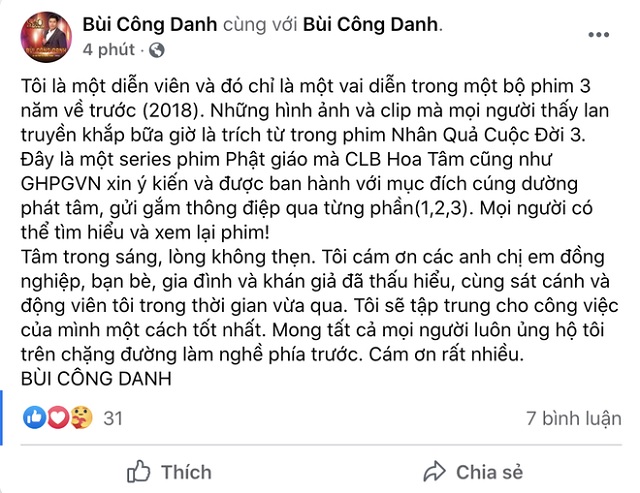 “Tôi là một diễn viên và đó chỉ là một vai diễn trong một bộ phim 3 năm về trước (2018). Những hình ảnh và clip mà mọi người thấy lan truyền khắp bữa giờ là trích từ trong phim Nhân Quả Cuộc Đời 3. Đây là một series phim mà CLB Hoa Tâm xin ý kiến và được ban hành với mục đích cúng dường phát tâm, gửi gắm thông điệp qua từng phần (1,2,3). Mọi người có thể tìm hiểu và xem lại phim!