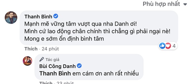 Không chỉ Hứa Minh Đạt mà diễn viên Thanh Bình cũng gửi lời động viên tới đàn em: "Mạnh mẽ vững tâm vượt qua nha danh ơi! Minh cứ lao động chân chính thì chẳng gì phải ngại nè! Mong em sớm ổn định bình tâm".