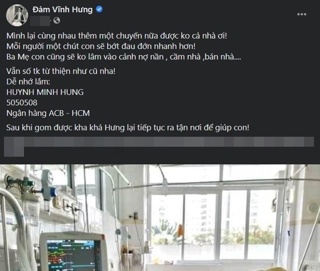 Trưa 20/4, Đàm Vĩnh Hưng gây chú ý khi bất ngờ chia sẻ loạt ảnh chụp một bé nằm trên giường bệnh. Đính kèm đó, nam ca sĩ kêu gọi mọi người: “Mình lại cùng nhau thêm một chuyến nữa được không cả nhà ơi! Mỗi người một chút con sẽ bớt đau đớn nhanh hơn! Ba mẹ con cũng sẽ không lâm vào cảnh nợ nần, cầm nhà, bán nhà…. Vẫn số tài khoản từ thiện như cũ nha! Sau khi gom được kha khá Hưng lại tiếp tục ra tận nơi để giúp con!”.