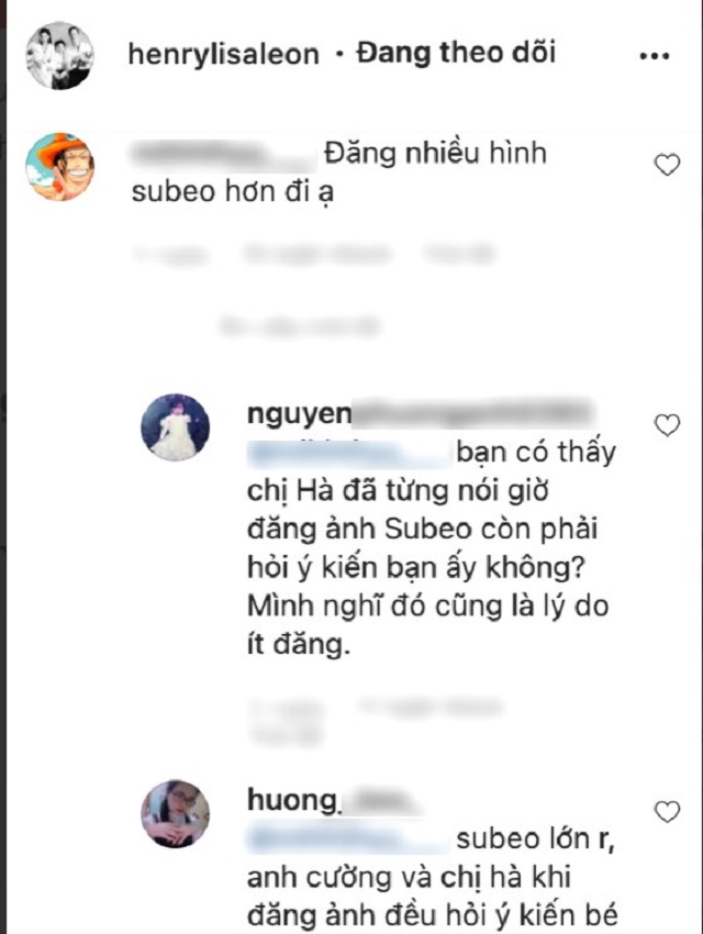 Dưới một hình ảnh vừa đăng tải, đã có khán giả để lại bình luận gây tranh cãi: "Nên đăng hình Subeo nhiều hơn". Nhiều khán giả đã lập tức ‘nói đỡ’ cho Hà Hồ: “Subeo lớn rồi, anh Cường và chị Hà khi đăng ảnh đều hỏi ý kiến bé.”, "Bạn có thấy chị Hà từng nói giờ đăng ảnh Subeo còn phải hỏi ý kiến bạn ấy không? Mình nghĩ đó cũng là lý do ít đăng".