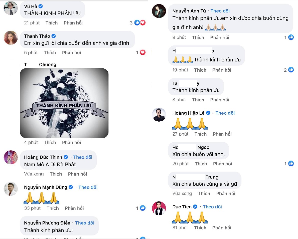 Khán giả đồng loạt chia buồn: "Cầu cho linh hồn người đã mất được siêu thoát", "Mong anh và gia đình sớm vượt qua nỗi mất mát này", "Chỉ biết nói lời chia buồn với anh", "Anh và gia đình đừng quá đau buồn nhé",...