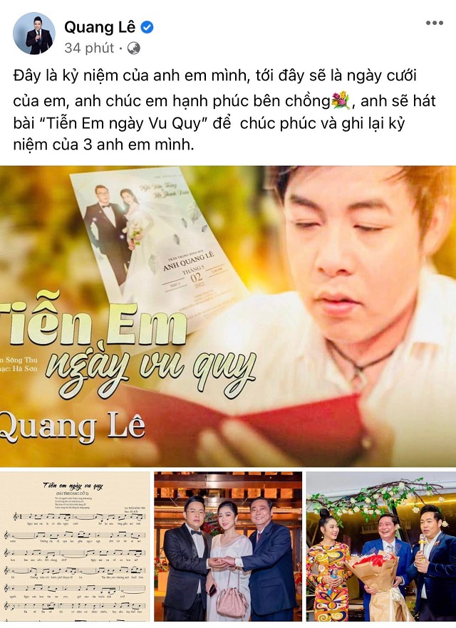 Quang Lê tuyên bố làm 1 điều đặc biệt trong lễ cưới của 'tình tin đồn' Hà Thanh Xuân và 'vua cá Koi'"Tình tin đồn" báo tin hỉ, thông tin phủ kín khắp mặt báo, Quang Lê chiều 27/4 đã đăng đàn nhắn gửi đến đàn em. Anh viết: "Đây là kỷ niệm của anh em mình, tới đây sẽ là ngày cưới của em, anh chúc em hạnh phúc bên chồng, anh sẽ hát bài “Tiễn Em Ngày Vu Quy” để chúc phúc và ghi lại kỷ niệm của 3 anh em mình".