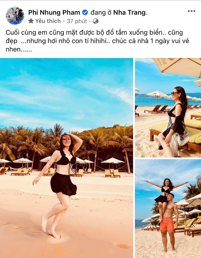 Sáng 5/5, Phi Nhung đăng tải lên trang cá nhân hình ảnh đi biển cùng dòng trạng thái: "Cuối cùng em cũng mặc được bộ đồ tắm xuống biển... Cũng đẹp nhưng hơi nhỏ con tí. Chúc cả nhà một ngày vui vẻ nhen".